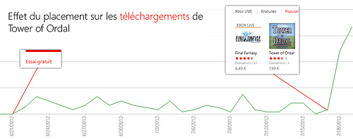 Je savais que le placement était important sur un store digital, mais ce n'est que quand Tower of Ordal s'est retrouvé côte à côte avec Final Fantasy que je l'ai réalisé. Pendant quelques jours, le nombre de téléchargement depuis le marketplace français a explosé. Malgré ça, le taux de conversion étant ce qu'il est, ça n'a eu que peu d'impact au final.