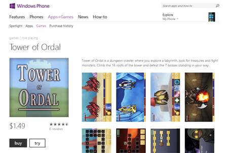 Tower of Ordal a finalement vu le jour sur le Windows Phone Marketplace le 5 novembre 2011, soit plus d'un an après la sortie de Reckless Squad. Au temps pour les projets plus modestes et l'itération plus courte...